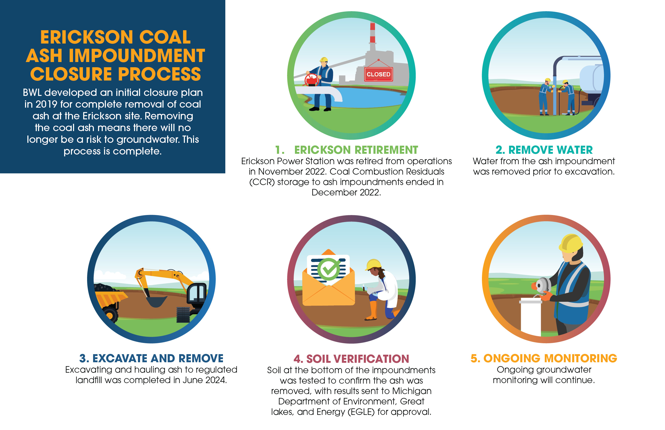 - Retirement of the 33-acre Ash Impoundment (2009 through 2014): BWL commenced a 4-year project to remove the ash from the impoundment and install a new process water recirculation system within the footprint of the previous impoundment. Over 562,663 cubic yards of ash was removed from the 33-acre impoundment and disposed of in a regulated landfill.